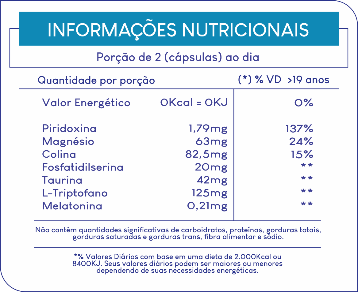 Cloridrato de Piridoxina, Magnésio Dimalato, Magnésio L-Treonato, Fosfatidilserina, Taurina, L-Triptofano, Melatonina, Bitartarato de Colina.
