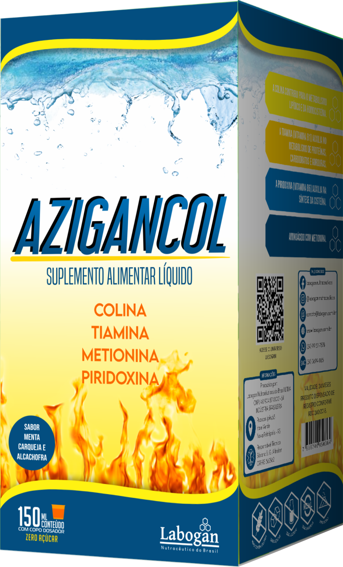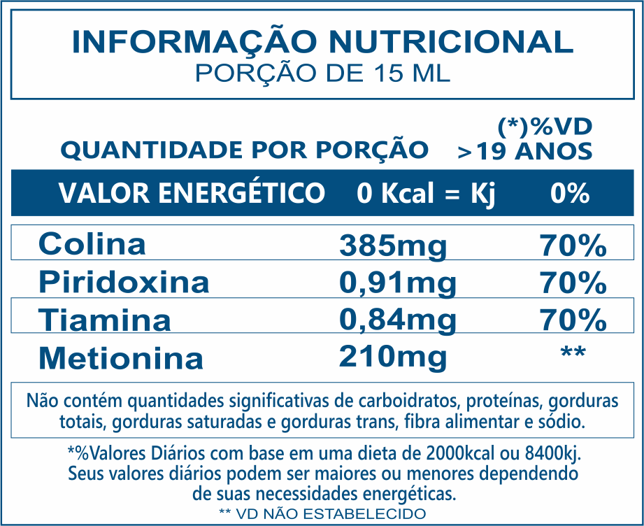 Bitartarato de Colina, Cloridrato de Piridoxina, Cianocobalamina, Conservante Benzoato de Sódio, Edulcorante Artificial Sacarina Sódica, Acidulante Ácido Cítrico, Espessante Goma Xantana, Corante Caramelo. Veículos: Água Purificada e Sorbitol 70%. Aroma de fluído de Carqueja, Boldo, Alcachofra, Berinjela, Menta e Hortelã.