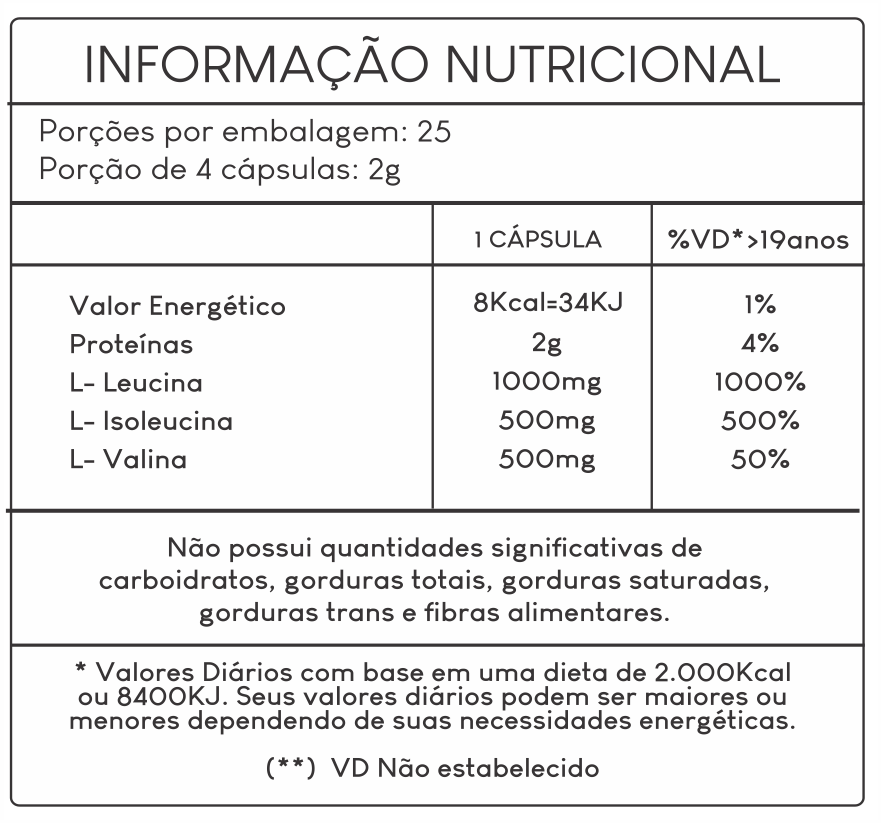 L-Leucina, L-Valina, L-Isoleucina, Estearato de Magnésio, Dióxido de Silício, Cápsula de Gelatina e Dióxido de Titânio.