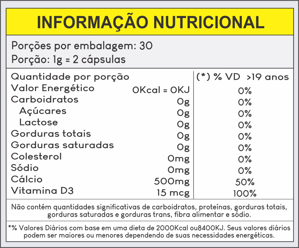 Carbonato de Cálcio, Concha de Ostra, Colecalciferol, Antiumectante Dióxido de Silício e Talco, Cápsula de Gelatina e Dióxido de Titânio.