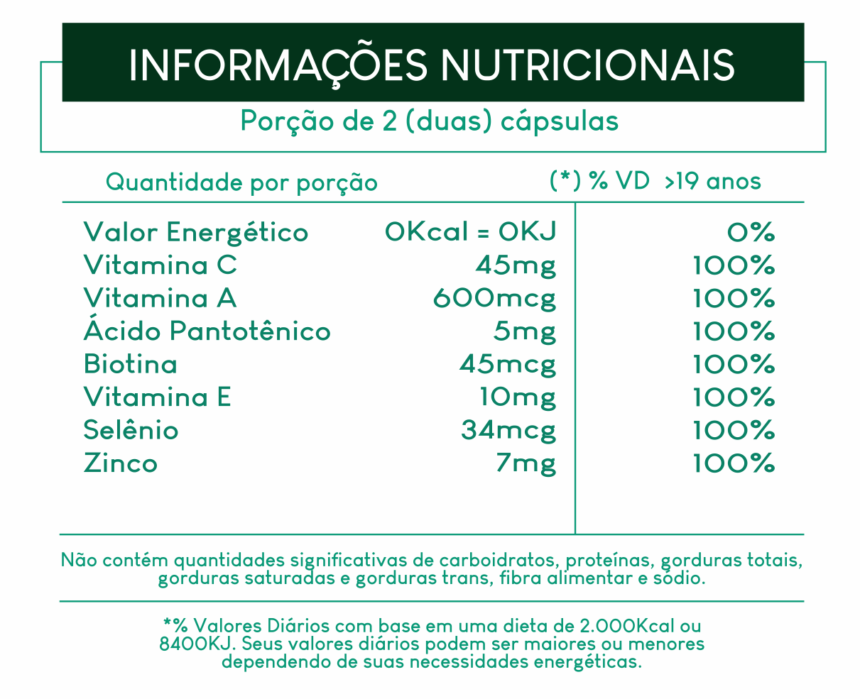 Ácido Ascórbico, Acetato de Retinol, Racealfatocoferol, Levedura de Selênio, Bisglicinato de Zinco, Biotina, Ácido Pantôtenico, Colágeno Hidrolisado, Amido, Antiumectante Dióxido de Silício, Talco, Cápsula de Gelatina e Dióxido de Titânio.