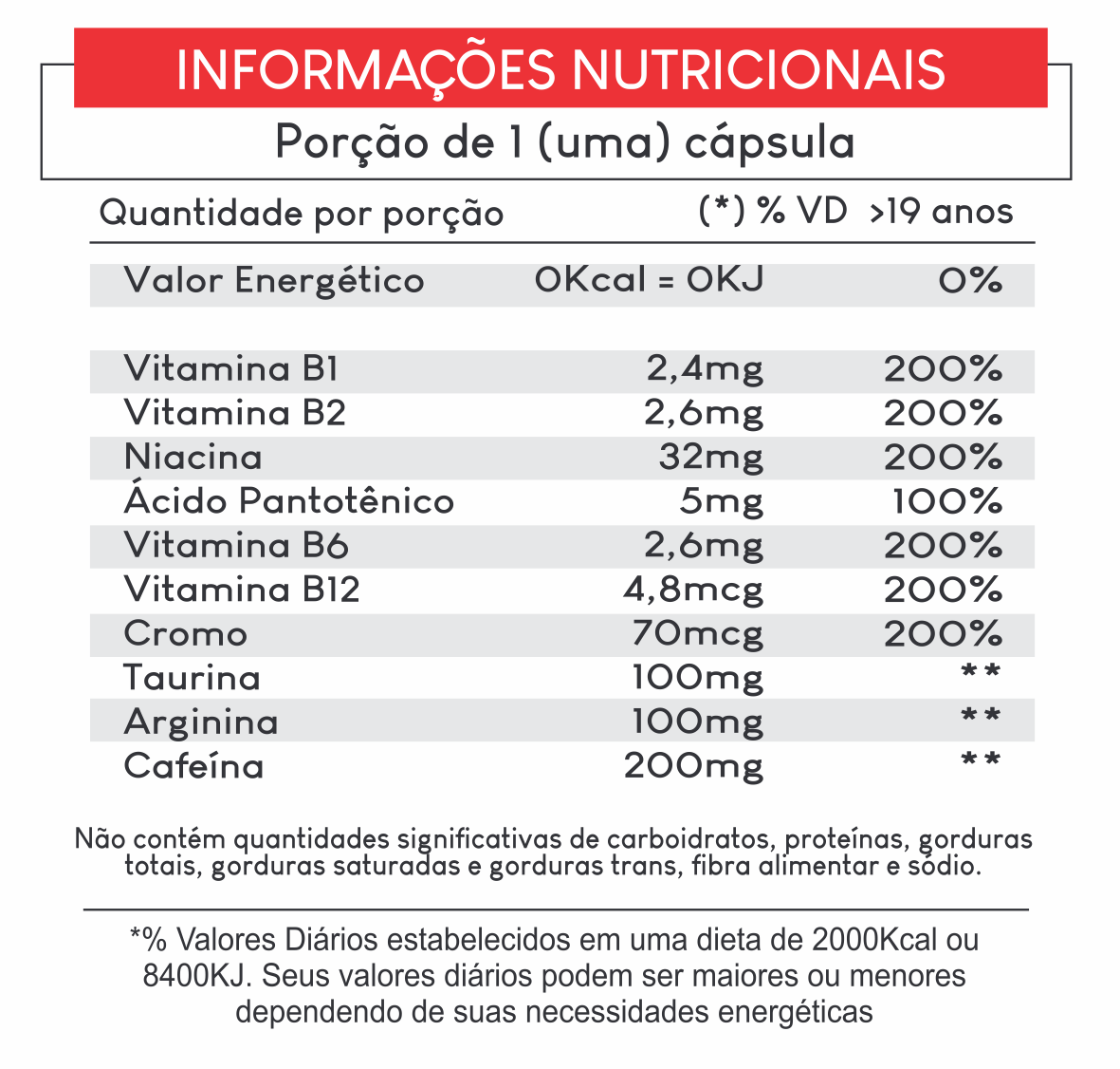Cloridrato de Tiamina, Riboflavina, Nicotinamida, Pantotenato de Cálcio, Cloridrato de Piridoxina, Cianocobalamina, Picolinato de Cromo, Arginina, Cafeína, Taurina, Amido de Milho, Antiumectante Dióxido de Silício e Talco.
