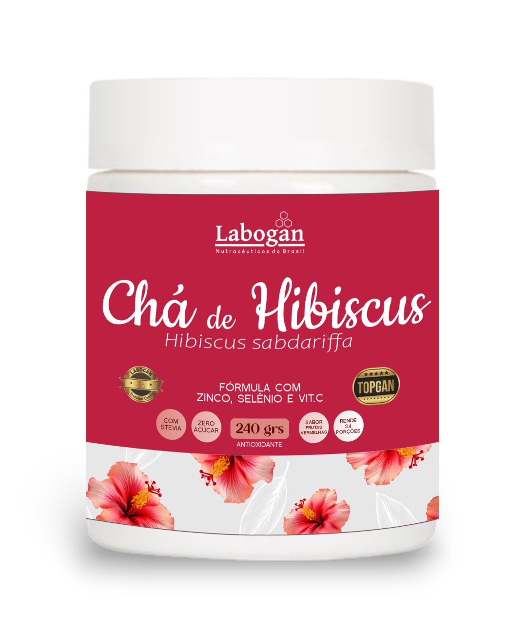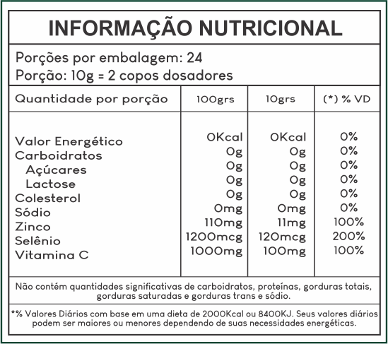 Polidextrose, Extrato de Chá de Hibiscus em pó, Bisglicinato de Zinco, Selênio Quelato, Ácido Ascórbico, Edulcorante: Glicosídeos de Steviol, Ácido Cítrico, Antiumectante Dióxido de Silício, Aroma Idêntico ao Natural de Frutas Vermelhas.