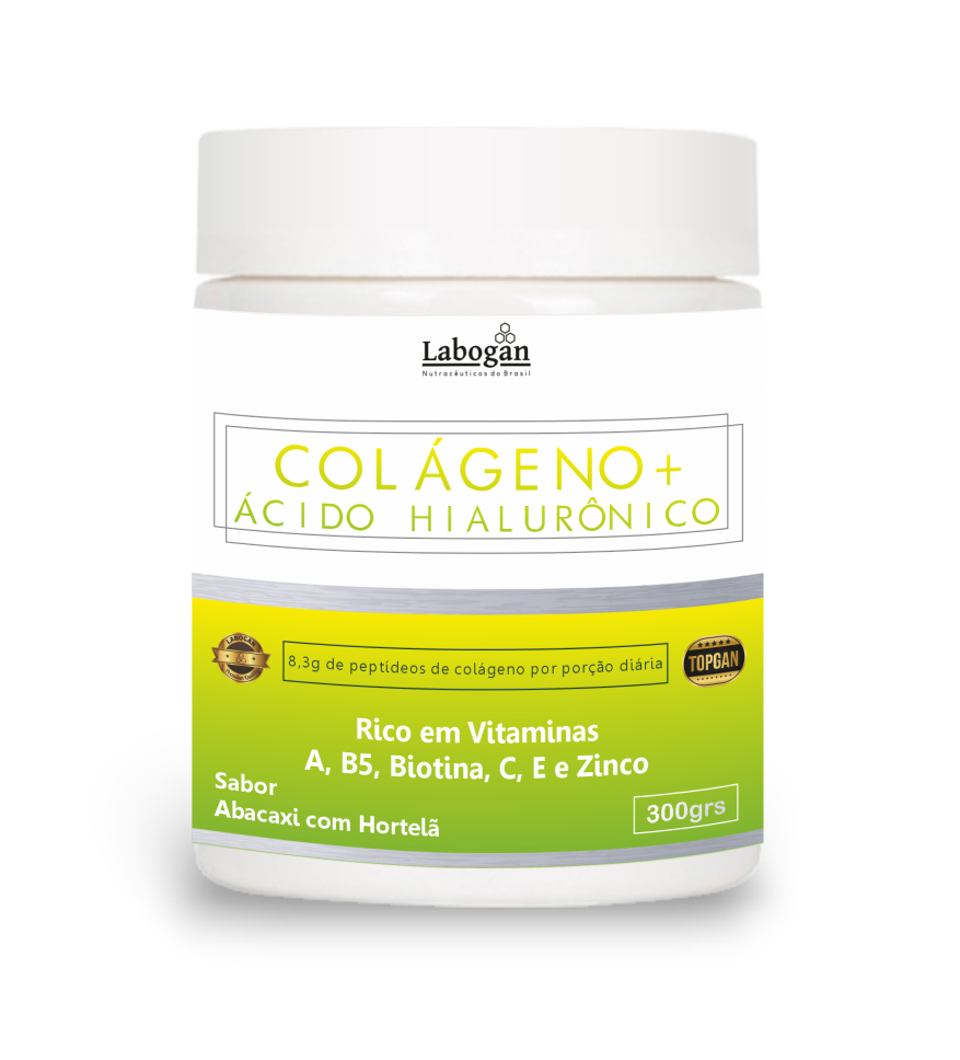 Colágeno Hidrolisado, Acetato de Retinol, Ácido Pantotênico, Ácido Ascórbico, Acetato de Alfatocoferol, Bisglicinato de Zinco, Acidulante Ácido Cítrico, Dióxido de Silício, Polidextrose, Edulcorante Natural de Glicosídeos de Steviol, Corante Artificial Tartrazina, Aroma Natural de Abacaxi com Hortelã.