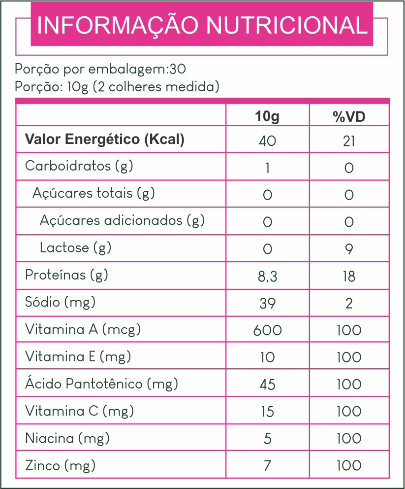 Colágeno Hidrolisado, Acetato de Retinol, Ácido Pantotênico, Ácido Ascórbico, Acetato de Alfatocoferol, Bisglicinato de Zinco, Acidulante Ácido Cítrico, Dióxido de Silício, Polidextrose, Edulcorante Natural de Glicosídeos de Steviol, Corante Artificial Vermelho Ponceau, Aroma Natural de Frutas Vermelhas.