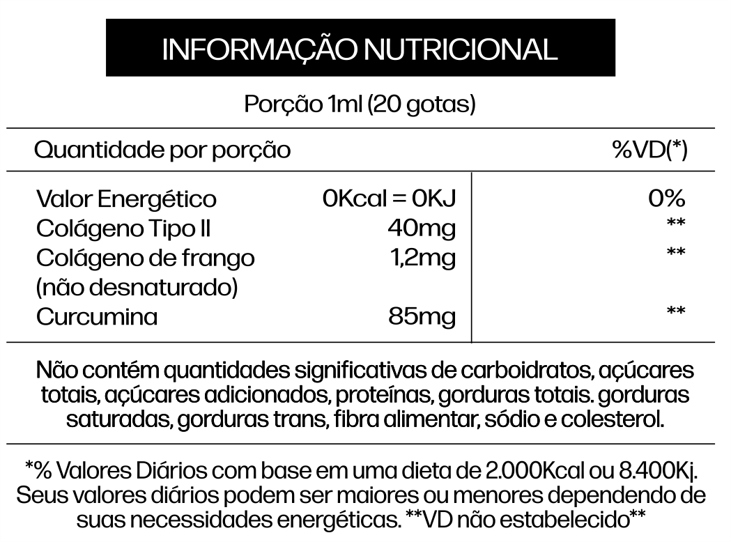 Água potável, extrato de rizoma de curcuma longa, colágeno de frango com colágeno tipo II não desnaturado, aroma idêntico ao natural de laranja, acidulante ácido cítrico, conservantes sorbato de potássio e benzoato de sódio, óleo essencial de menta e edulcorante glicosídeos de esteviol.
