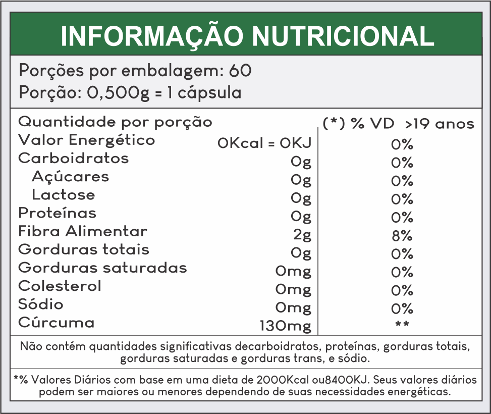 Extrato de Rizoma de Cúrcuma longa, Cúrcuma em pó. Antiumectante Dióxido de Silício e Talco. Cápsula de Gelatina e Dióxido de Titânio.