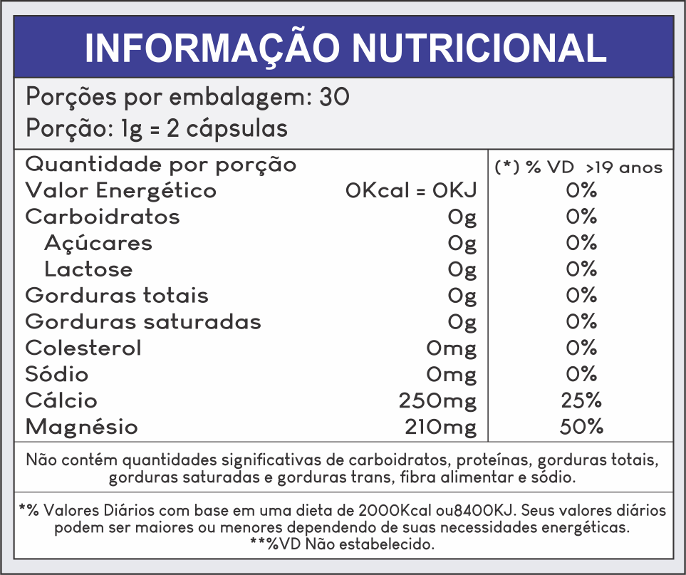 Dolomita, Amido de Milho, Antiumectante Dióxido de Silício e Talco. Cápsula de Gelatina e Dióxido de Titânio.