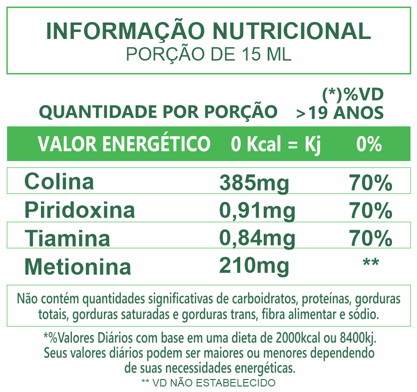 Veículo Água Purificada, (INS 420) Sorbitol 70%, Conservante (INS 211) Benzoato de Sódio, Edulcorante Artificial (INS 954) Sacarina Sódica, Espessante Goma Xantana, Corante Caramelo, Aroma Idêntico ao Natural de Menta e Aroma Fluído de Carqueja. Bitartarato de Colina, Cloridrato de Piridoxina e Cloridrato de Tiamina.