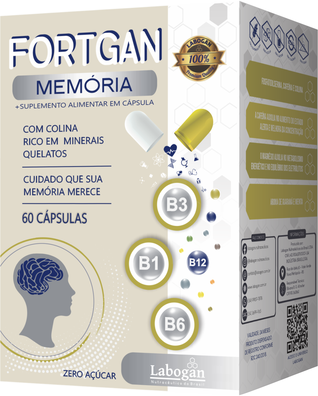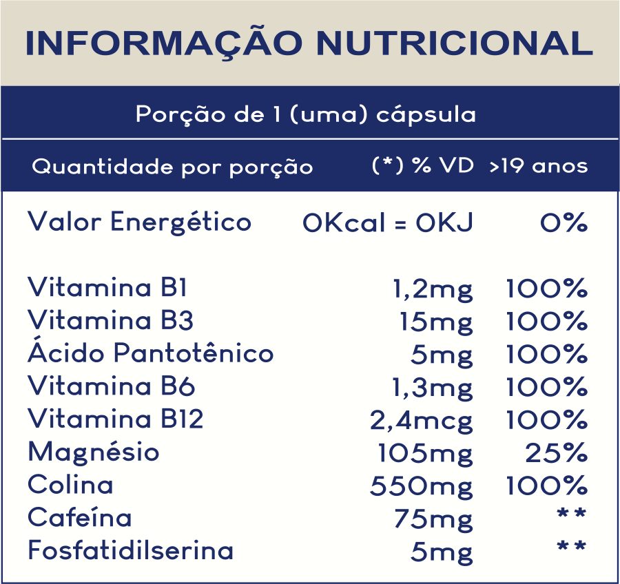 Cloridrato de Tiamina, Nicotinamida, Ácido Pantotênico, Cloridrato de Piridoxina, Cianocobalamina, Bitartarato de Colina, Sulfato de Magnésio, Fosfatidilserina e Cafeína. Amido de milho, Antiumectante Dióxido de silício e talco, Cápsula de gelatina e dióxido de titânio.