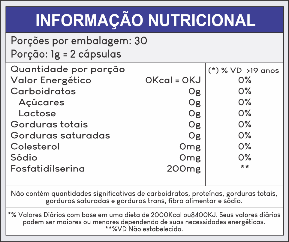 Fosfatidilserina, Amido de Milho, Antiumectante Dióxido de Silício e Talco. Cápsula de Gelatina e Dióxido de Titânio.