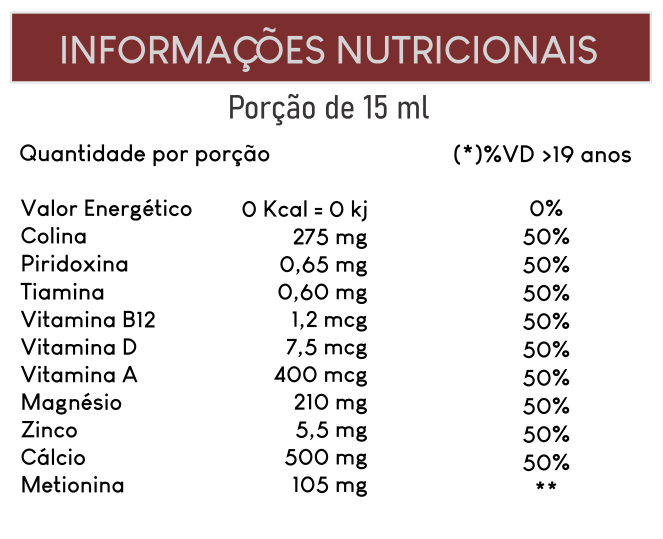 Bitartarato de Colina, Cloridrato de Piridoxina, Cloridrato de Tiamina, Cianocobalamina, Colecalciferol, Acetato de Retinol, Fosfato de Cálcio tribásico, Sulfato de Magnésio, Sulfato de Zinco e Metionina. Veículos: Água Purificada, (INS 420) Sorbitol 70%, Conservante (INS 211) Benzoato de Sódio, Edulcorante Artificial (INS 954) Sacarina Sódica, Expesssante Goma Xantana, Corante (INS 150a) Caramelo, Aroma Idêntico ao Natural de Menta, Aroma Fluído em um total de 2% de Arnica Nacional, Castanha da Índia, Canela de Velho, Folha de Oliveira, Jurubeba, Salsaparrilha, Sucupira, quina-quina, Açafrão, Arruda, Funcho, Marcela e Barbatimão.