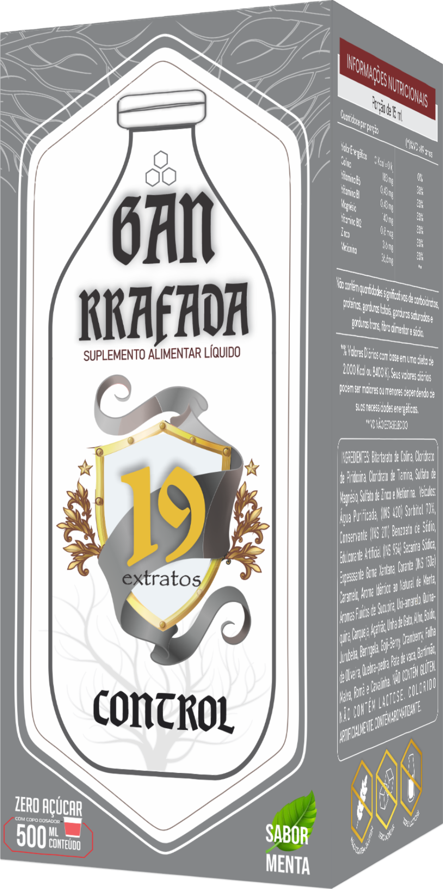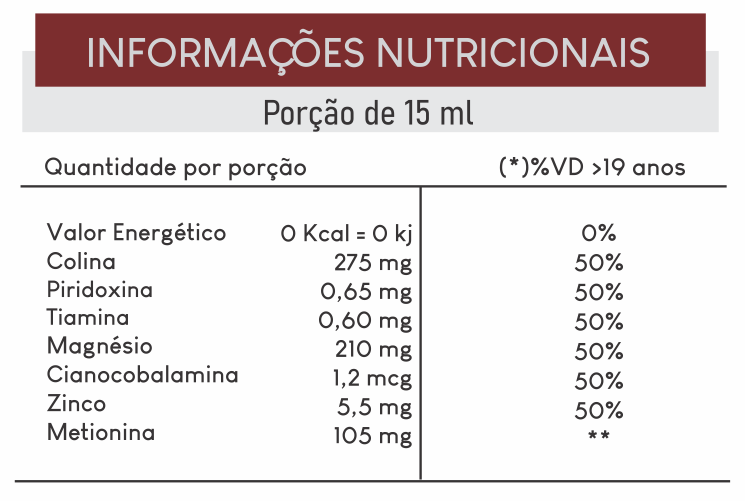 Bitartarato de Colina, Cloridrato de Piridoxina, Cloridrato de Tiamina, Sulfato de Magnésio, Sulfato de Zinco e Metionina. Veículos: Água Purificada, (INS 420) Sorbitol 70%, Conservante (INS 211) Benzoato de Sódio, Edulcorante Artificial (INS 954) Sacarina Sódica, Expesssante Goma Xantana, Corante (INS 150a) Caramelo, Aroma Idêntico ao Natural de Menta, Aromas Fluídos num total de 2% de Sucupira, Uxi-amarelo, Quina-quina, Carqueja, Açafrão, Unha de Gato, Alho, Boldo, Jurubeba, Beringela, Goji-Berry, Cramberry, Folha de Oliveira, Quebra-pedra, Pata de vaca, Bartimão, Malva, Romã e Cavalinha.
