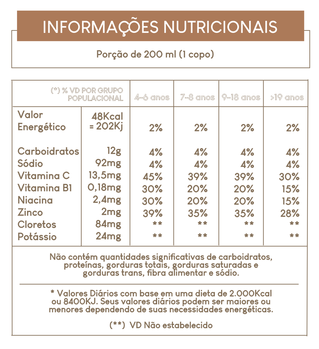 Água purificada, Sacarose, frutose, acidulante ácido cítrico, citrato de sódio, aroma idêntico ao natural de água de coco, fosfato de potássio monobásico, conservantes sorbato de potássio e benzoato de sódio, cloreto de potássio, cloreto de magnésio, bisglicinato de zinco, ácido ascórbico, nicotinamida, cloridrato de tiamina, corante artificial dióxido de titânio, espessante goma xantana, edulcorantes glicosídeos de esteviol, sequestrante edta calcio dissódico.