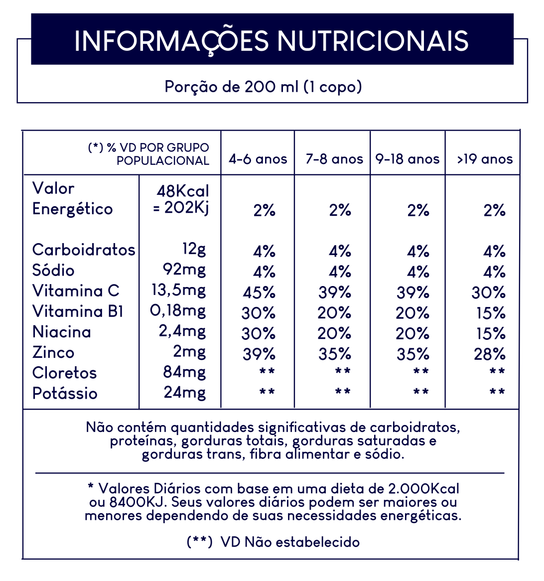 Água purificada, Sacarose, frutose, acidulante ácido cítrico, citrato de sódio, aroma idêntico ao natural de guaraná, fosfato de potássio monobásico, conservantes sorbato de potássio e benzoato de sódio, cloreto de potássio, cloreto de magnésio, bisglicinato de zinco, ácido ascórbico, nicotinamida, cloridrato de tiamina, corante artificial tartrazina e azul brilhante, espessante goma xantana, edulcorantes glicosídeos de esteviol, sequestrante edta calcio dissódico.
