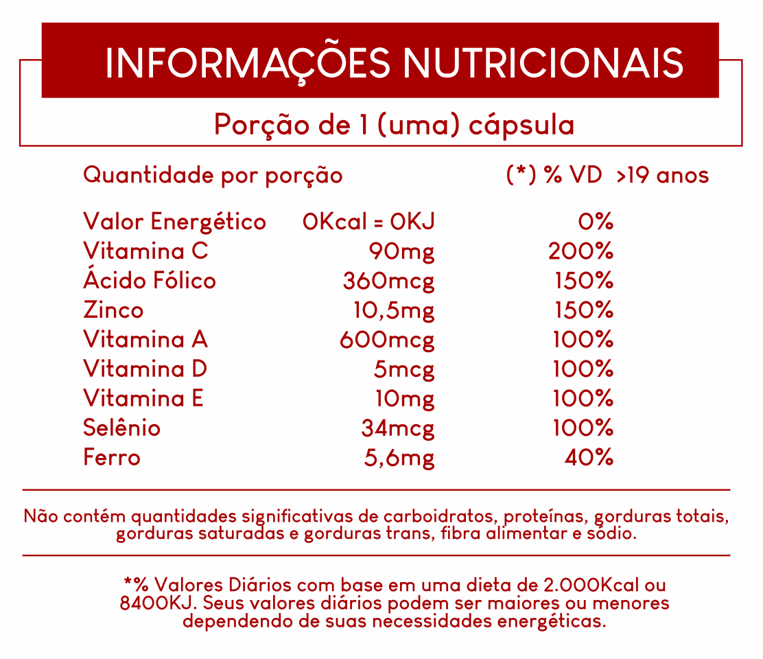 Acetato de Racealfatocoferol, Bisglicinato de Ferro, Acetato de Retinol, Ácido Fólico, Levedura de Selênio, Vitamina D3, Amido de milho, Antiumectante Dióxido de Silício e Talco, Cápsula de Gelatina e Dióxido de Titânio.