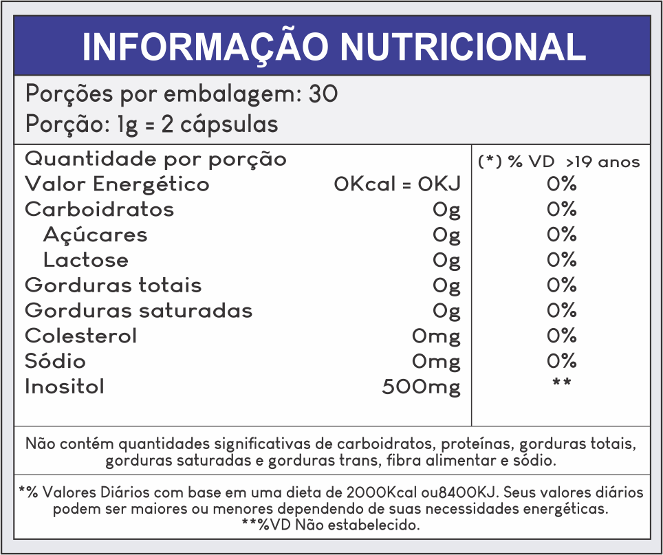Inositol, Amido de Milho, Antiumectante Dióxido de Silício e Talco. Cápsula de Gelatina e Dióxido de Titânio.