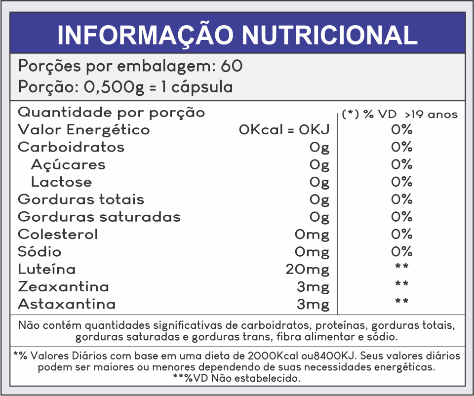 Luteína, Zeaxantina, Astaxantina, Amido de Milho, Antiumectante Dióxido de Silício e Talco. Cápsula de Gelatina e Dióxido de Titânio.
