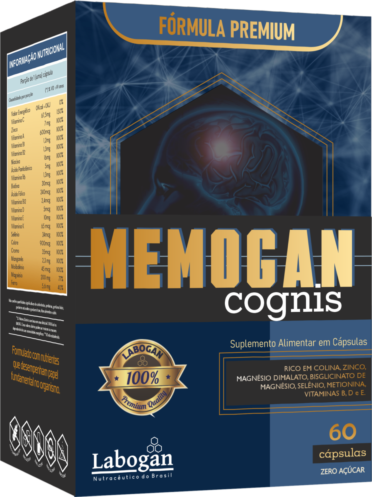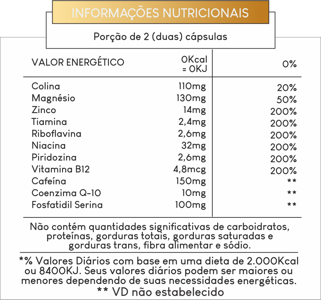 Bitartarato de Colina, Bisglicinato de Magnésio, Bisglicinato de Zinco, Cloridrato de Tiamina, Riboflavina, Nicotinamida, Cloridrato de Piridoxina, Cianocobalamina, Cafeína, Coenzima Q-10 e Fosfatidil Serina. Amido de Milho, Antiumectante Dióxido de Silício e Talco. Cápsula de Gelatina, Dióxido de Titânio,