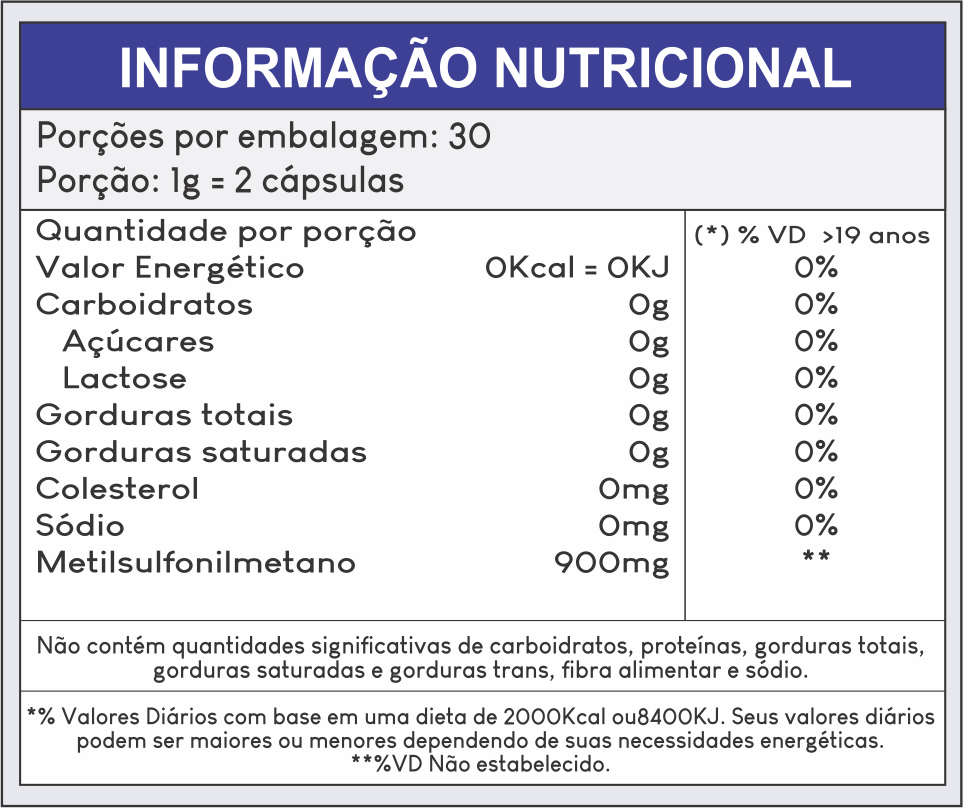 Metilsulfonilmetano, Amido de Milho, Antiumectante Dióxido de Silício e Talco. Cápsula de Gelatina e Dióxido de Titânio.