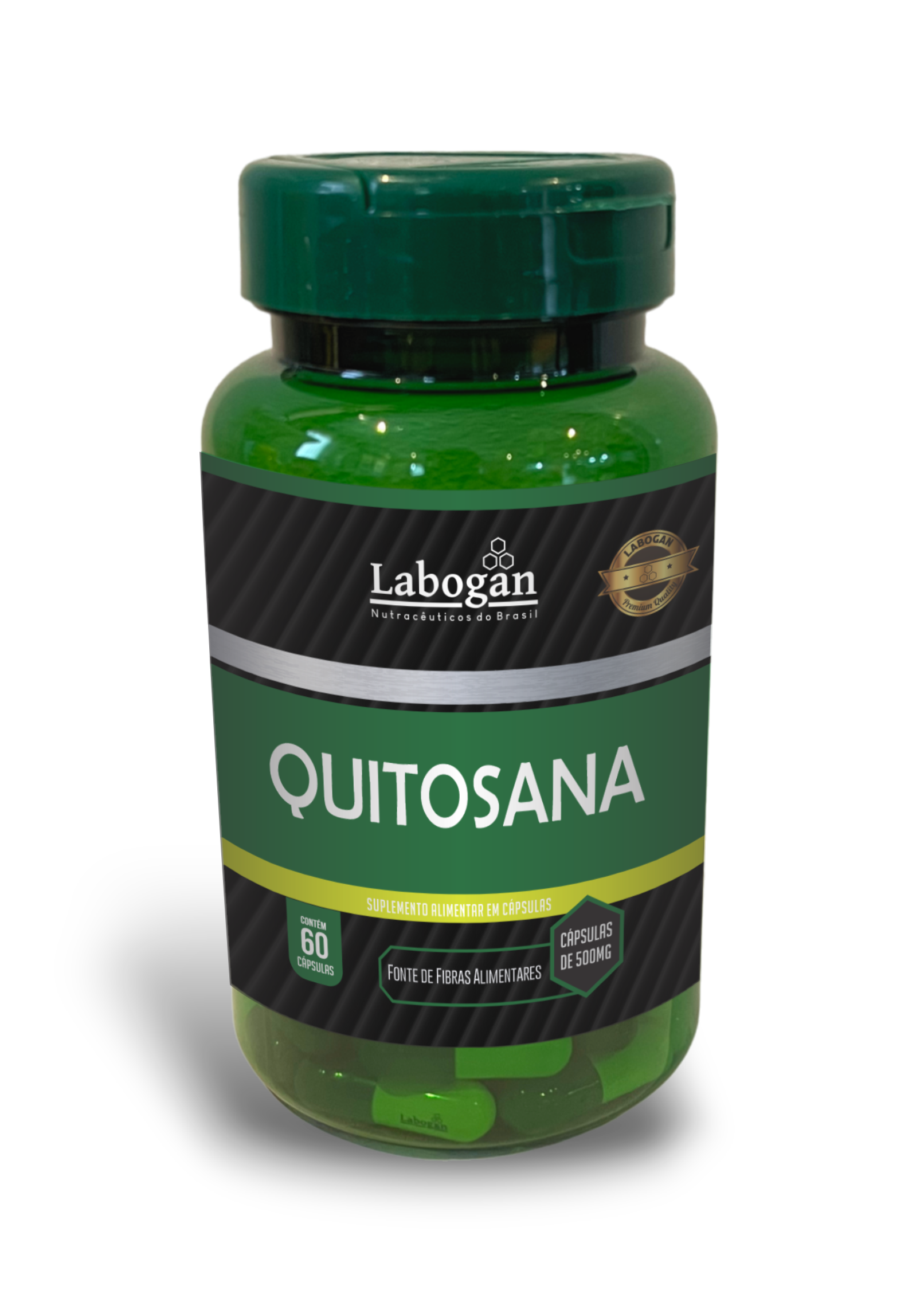 Quitosana em pó, Antiumectante Dióxido de Silício e Talco. Cápsula de Gelatina e Dióxido de Titânio.
