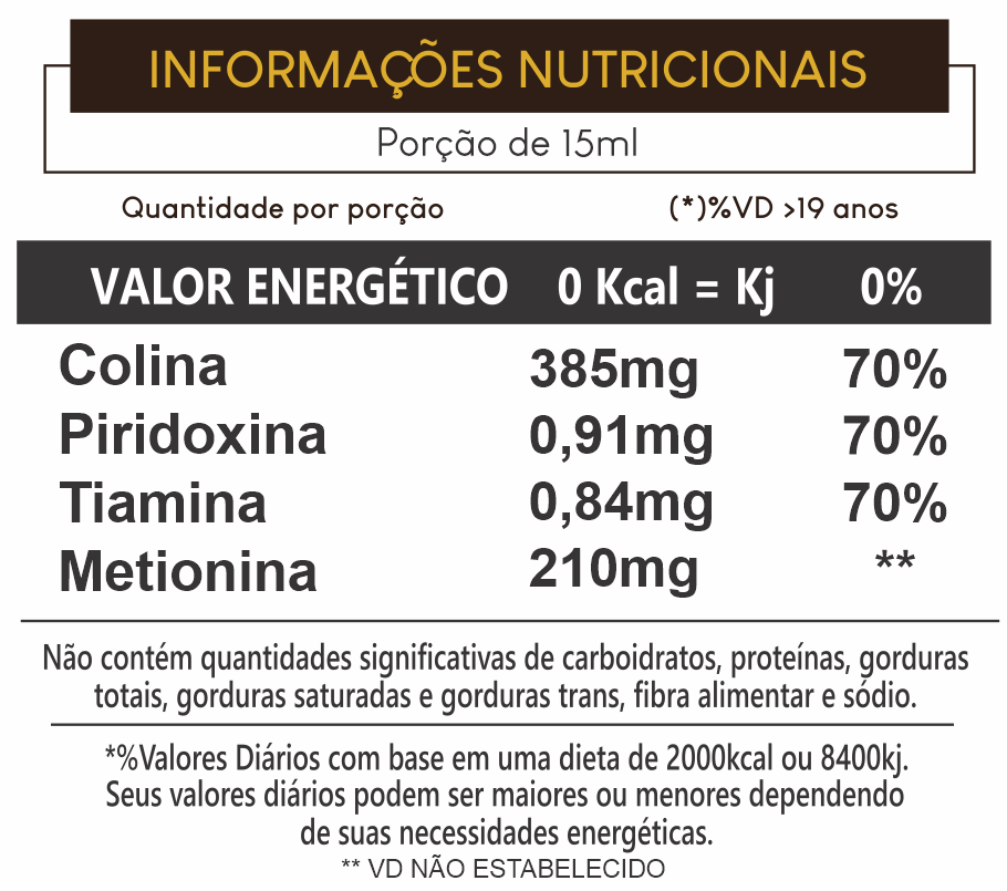Bitartarato de Colina, Cloridrato de Piridoxina, Cloridrato de Tiamina, Veiculo Água Purificada, (INS 420) Sorbitol 70%, Conservante (INS211) Benzoato de Sódio, Edulcorante Artificial (INS954) Sacarina Sódica, Espessante Goma Xantana, Corante (INS 150) Caramelo, Aroma Idêntico ao Natural de Menta