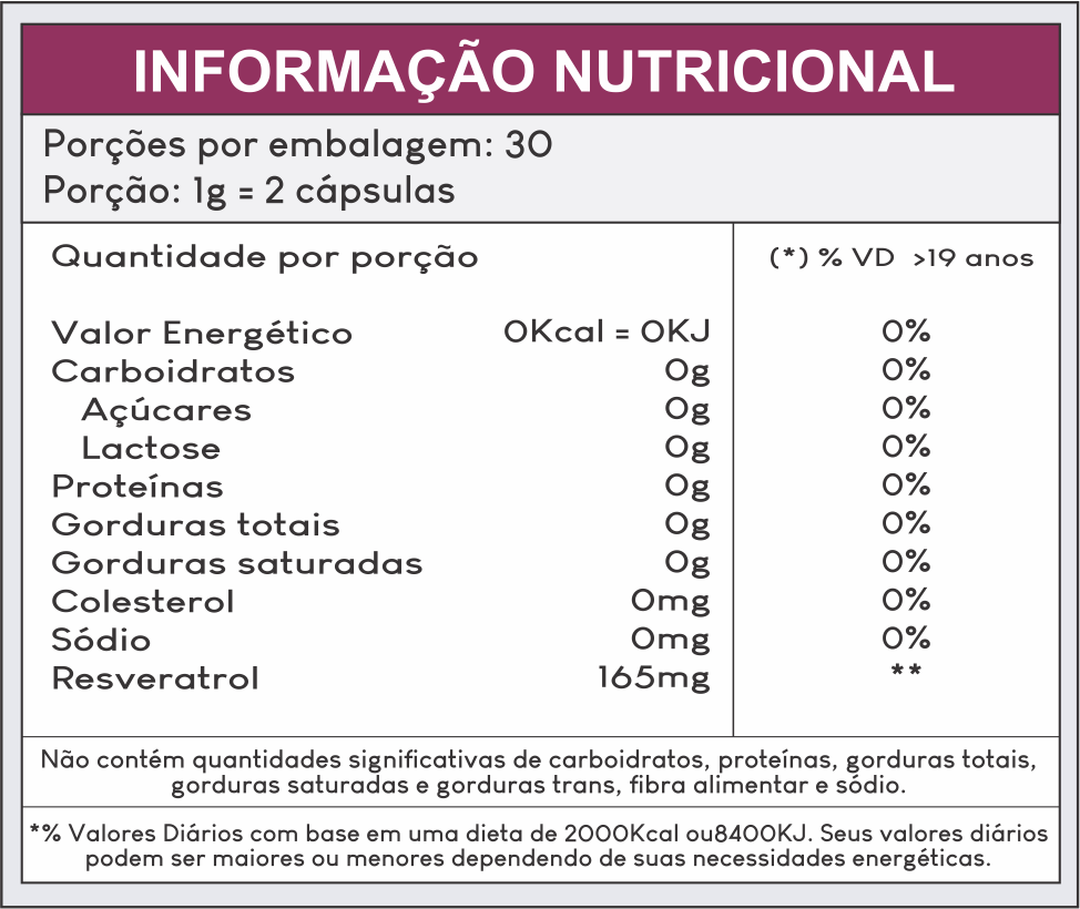 Trans-Resveratrol sintético, Celulose Microcristalina, Estereato de Magnésio, Amido de Milho, Antiumectante Dióxido de Silício e Talco, Cápsula de Gelatina, Dióxido de Titânio.