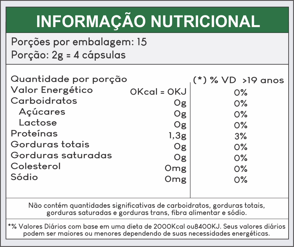 Spirulina em pó, Antiumectante Dióxido de Silício e Talco. Cápsula de Gelatina e Dióxido de Titânio.