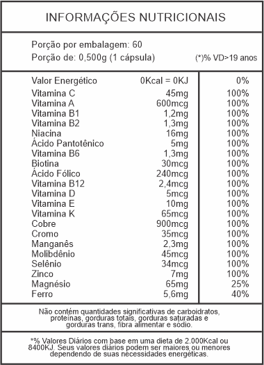 Bisglicinato de Magnésio, Ácido Ascórbico, Nicotinamida, Acetato de Racealfatocoferol , Bisglicinato de Zinco, Pantotenato de Cálcio, Bisglicinato de Ferro, Riboflavina, Cloridrato de Piridoxina, Cloridrato de Tiamina, Bisglicinato de Manganês, Bisglicinato de Cobre, Acetato de Retinol, Ácido Fólico, Menaquinona, Levedura de Selênio, Biotina, Molibdato de Sódio, Picolinato de Cromo, Colecalciferol, Cianocobalamina, Amido de milho, Antiumectante Dióxido de silício e talco, Cápsula de gelatina e dióxido de titânio.