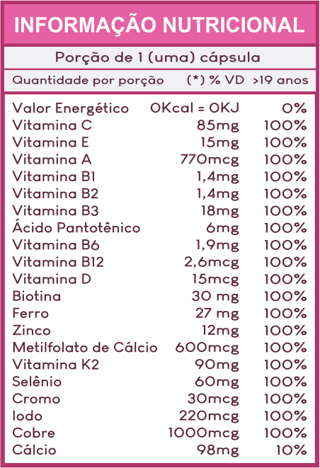 Ácido Ascórbico, Acetato de Retinol, Acetato de Racealfatocoferol, Cloridrato de Tiamina, Cloridrato de Piridoxina, Riboflavina, Ácido Pantotênico, Cianocobalamina, Colecalciferol, Biotina, Bisglicinato de Ferro, Bisglicinato de Zinco, Metilfolato de Cálcio, Menaquinona, Levedura de Selênio, Picolinato de Cromo, Bisglicinato de Cobre, Iodeto de Potássio, Carbonato de Cálcio Concha de Ostras, Amido de Milho, Dióxido de Silício e Talco. Cápsula de Gelatina e Dióxido de Titânio.
