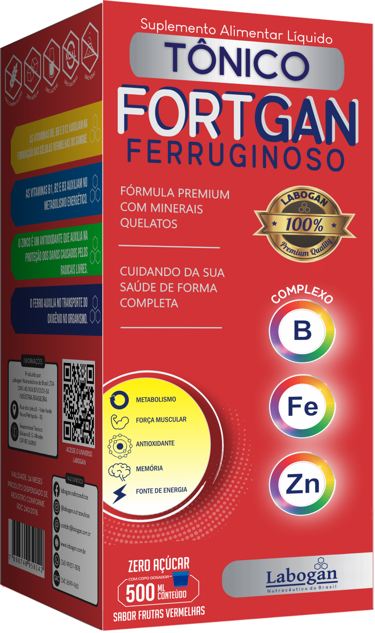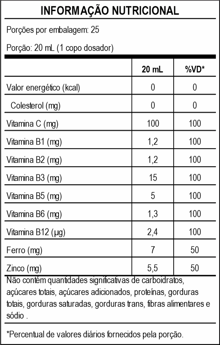 Ácido Ascórbico, Nicotinamida, Sulfato de Ferro, Sulfato de Zinco, Pantotenato de Cálcio, Cloridrato de Tiamina, Riboflavina, Cloridrato de Piridoxina, Cianocobalamina, Conservante Benzoato de Sódio, Edulcorante Artificial Sacarina Sódica, Acidulante Ácido Cítrico, Corante Caramelo e Espessante Goma Xantana. Veículos: Água Purificada e Sorbitol 70%. Aroma idêntico ao Natural de Frutas Vermelhas.