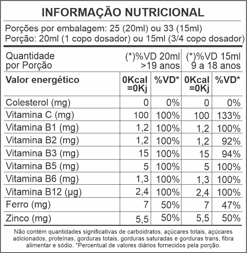 Ferro, Pantetonato de Cálcio, Bisglicinato de Zinco, Riboflavina, Cloridrato de Piridoxina, Cloridrato de Tiamina, Cianocobalamina, Conservante Benzoato de Sódio Edulcorante Artificial Sacarina Sódica, Acidulante Ácido Cítrico, Espessante Goma Xantana, Corante Caramelo. Veículos: Agua Purificada e Sorbitol 70%. Aroma idêntico ao Natural de Frutas Vermelhas.