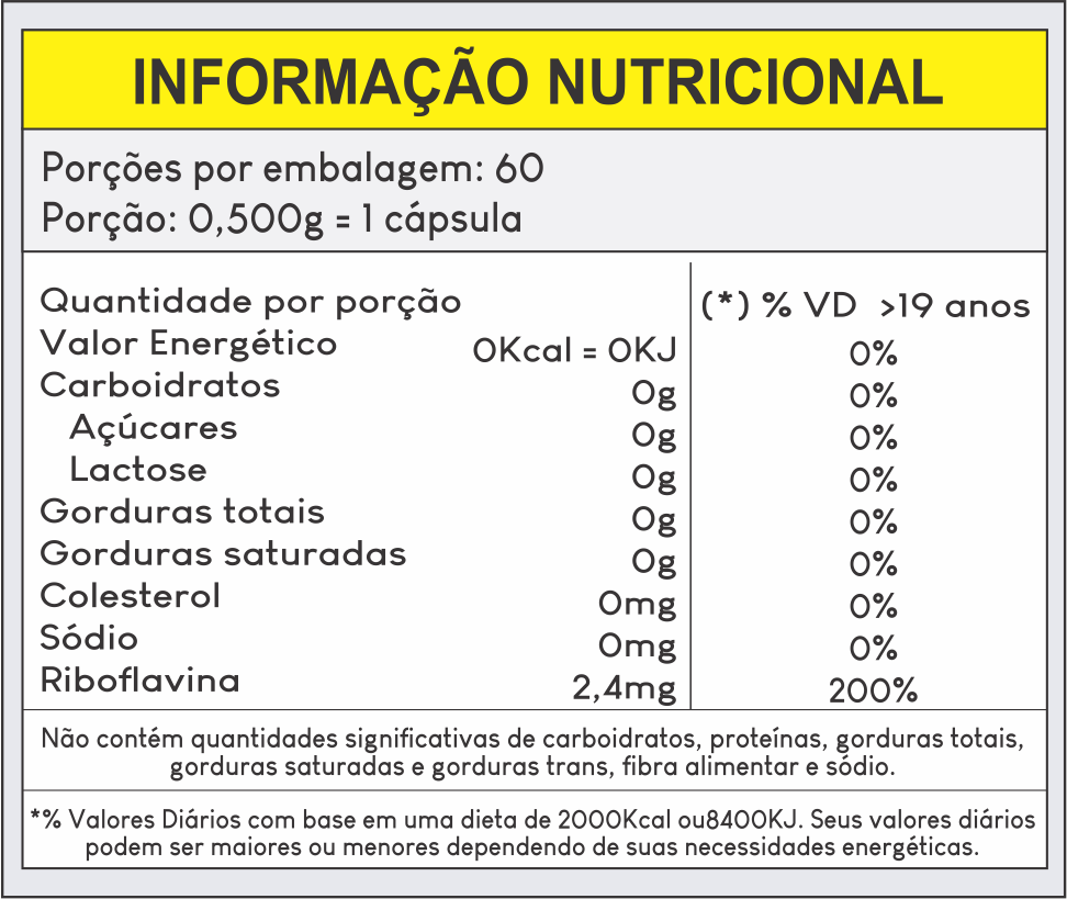 Riboflavina, Amido de Milho, Antiumectante Dióxido de Silício e Talco. Cápsula de Gelatina e Dióxido de Titânio.
