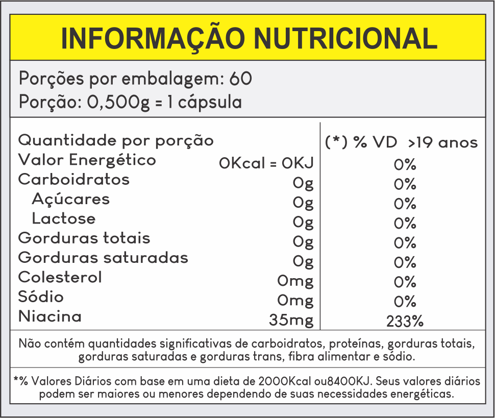 Niacina, Amido de Milho, Antiumectante Dióxido de Silício e Talco. Cápsula de Gelatina e Dióxido de Titânio.