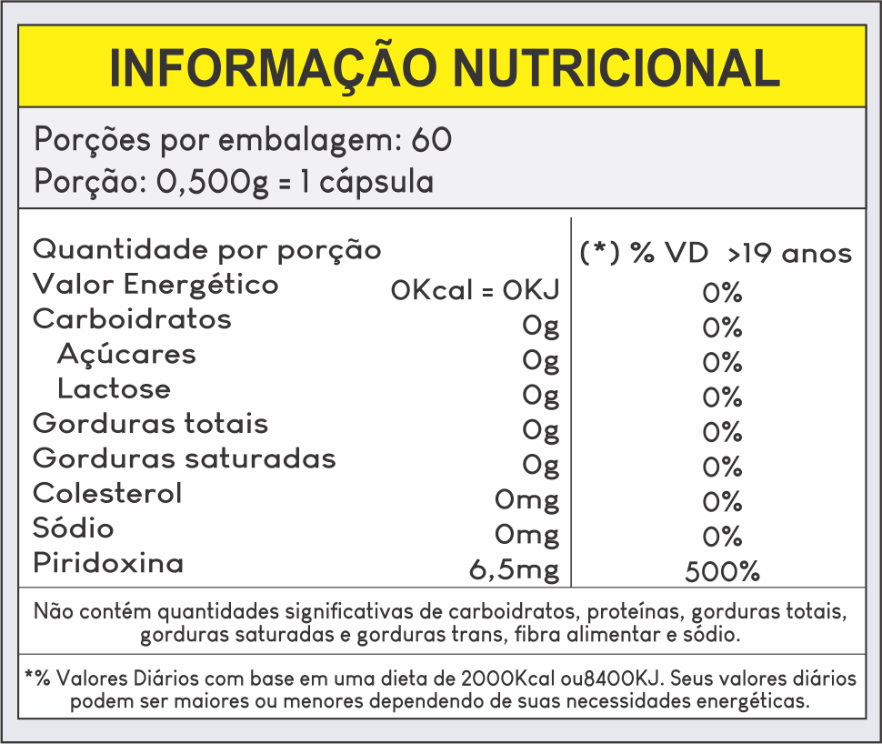 Cloridrato de Piridoxina, Amido de Milho, Antiumectante Dióxido de Silício e Talco. Cápsula de Gelatina e Dióxido de Titânio.