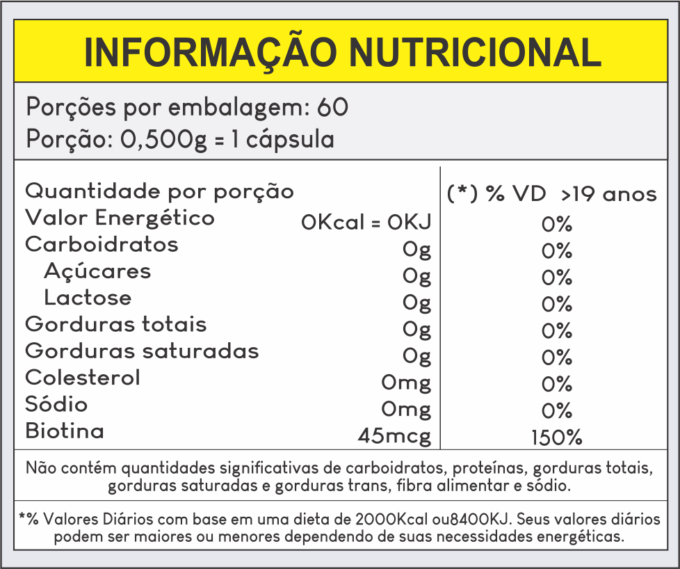 Biotina, Amido de Milho, Antiumectante Dióxido de Silício e Talco. Cápsula de Gelatina e Dióxido de Titânio.