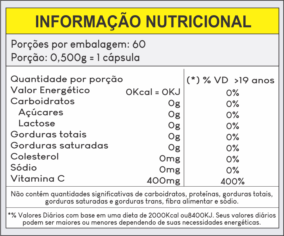 Ácido Ascórbico, Amido de Milho, Antiumectante Dióxido de Silício e Talco. Cápsula de Gelatina e Dióxido de Titânio.