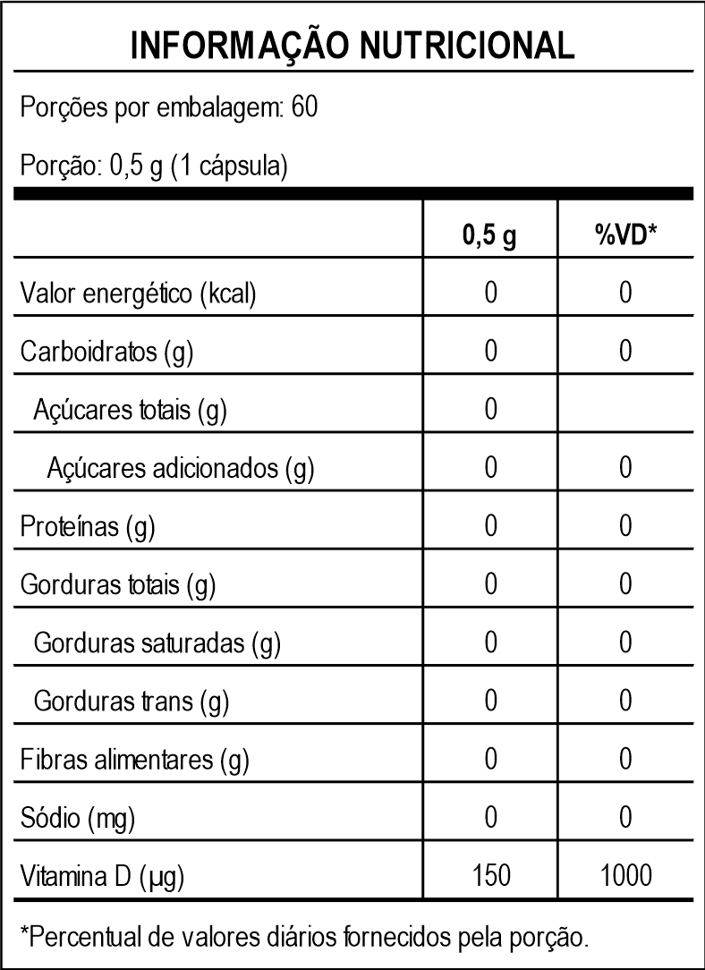 Vitamina D3, Amido de Milho, Antiumectante, Dióxido de Silício e Talco, Cápsula de Gelatina e Dióxido de titânio.