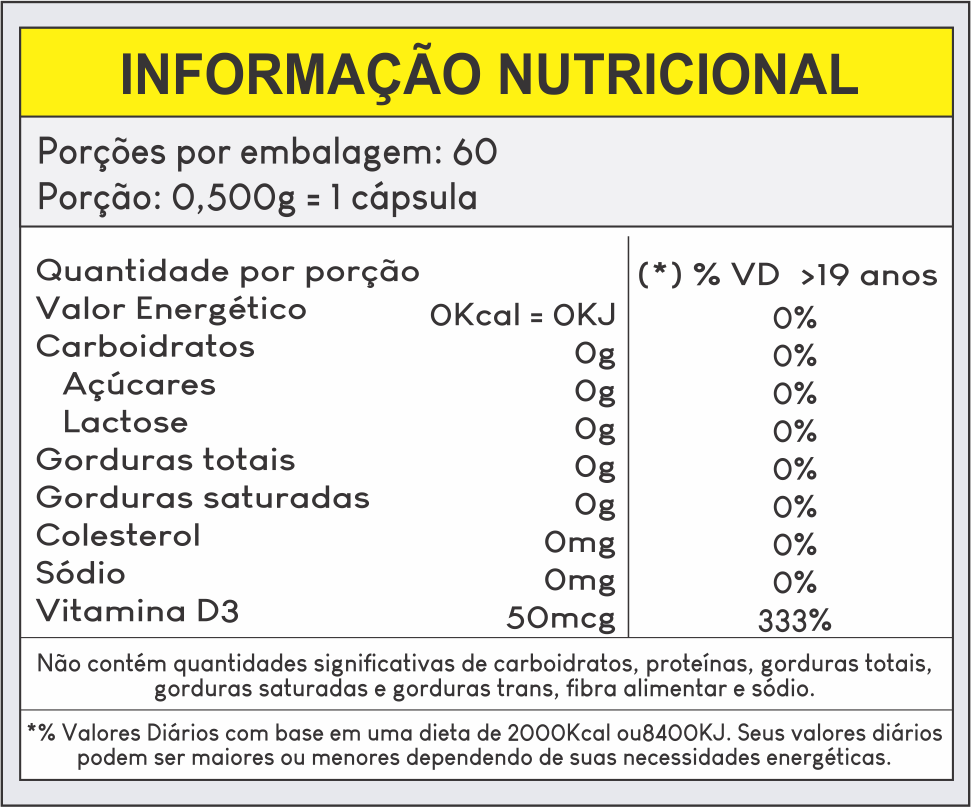 Colecalciferol, Amido de Milho, Antiumectante Dióxido de Silício e Talco. Cápsula de Gelatina e Dióxido de Titânio.